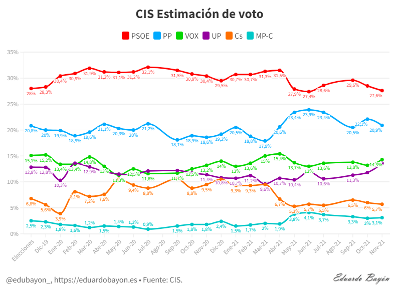 Este miércoles se ha hecho público el barómetro del CIS correspondiente al mes de noviembre. El PSOE conserva la primera posición con el 27,6% de estimación de voto. El PP es segundo con 20,9%, más de un punto menos que en octubre. En tercera posición continúa Vox con 14,3%. Cuarto es Unidas Podemos con el 13,6% de los votos. Ambas formaciones protagoni…